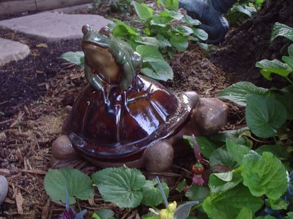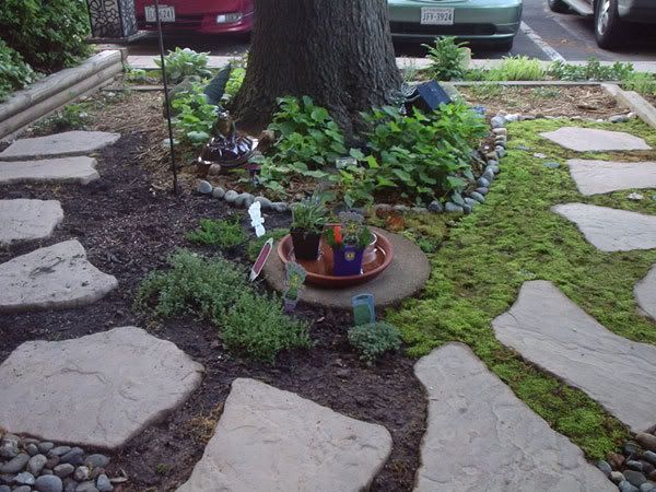 As I have decided the center area around Grendel was going to be more or less plantless I decided I needed some stepping stones. Freecycle came through on that account, and handily enough from a neighbor right around the corner from me. I did need to go dig twelve large, poured concrete stone fascimiles out of their back yard (those suckers were heavy!) but I also got 6 round pavers thrown into the bargain. No idea what I was going to do with them, but I lugged those suckers home too, figuring some use would occur to me, or that I could always freecycle them again. So Grendel has a cute little path circling her now. They were just sitting in the dirt though, which wasn't going to work in the long run; my yard tends to turn into a miniature pond when it rains hard.