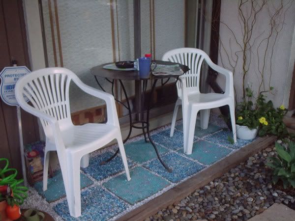 Up by my house I have planters and other pots along with a little tree shaped table & 2 chairs, hereby allowing a nice, relaxing spot from which to watch the garden grow, drink morning coffee, an evening glass of wine and so forth. The problem is, it's dirt and my spigot/hose drip into the dirt and create mud. My table and chairs were slowly settling into the mud making this a not so nice, relaxing place, but rather a place to perch precariously, hoping to avoid too much more sinkage. So I've been thinking for the week following what to do about this. Options that I came up with were to pour cement there, making it a little patio (which I don't even begin to pretend to know how to do), get some paving slabs at Homey D's (looked, didn't really like the options in my price range), gravelly rocks (eh, not very exciting) or fashioning something of my own design. Being the crafty person that I am, which do you think ended up coming to pass? Yep, I had a New Project. Woot.